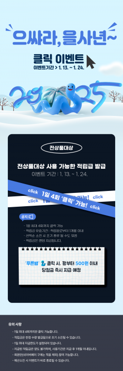 ※ 강원더몰 이용 시 나타나는 뱀 이모티콘을 클릭하면 랜덤 적립금 지급! ※ 1일 최대 지급 한도 : 1,000원 ※ 이벤트 기간 내 아이디당 최대 지급(누적) 한도 : 2,500원